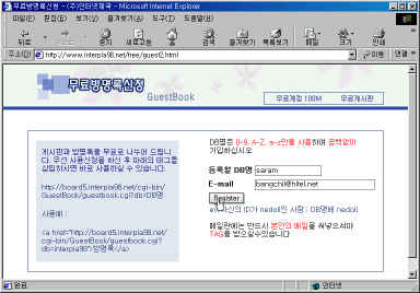 3) [¹«·á¹æ¸í·Ï½Åû]ÆäÀÌÁö°¡ ¿¸³´Ï´Ù. ¿©±â¼ [µî·ÏÇÒ DB¸í]°ú [E-mail]À» ÀÔ·ÂÇϰí [Register]¸¦ Ŭ¸¯ÇÕ´Ï´Ù. µî·ÏÇÒ DB¸íÀº ½ÅûÀÚ ÀÓÀÇ·Î ½ÅûÇÏ¸é µÇÁö¸¸ E-mailÀº ½ÅûÀÚ°¡ Áö±Ý »ç¿ëÁßÀÎ E-mail ÁÖ¼Ò¸¦ ÀÔ·ÂÇÏ¿©¾ß ÇÕ´Ï´Ù.